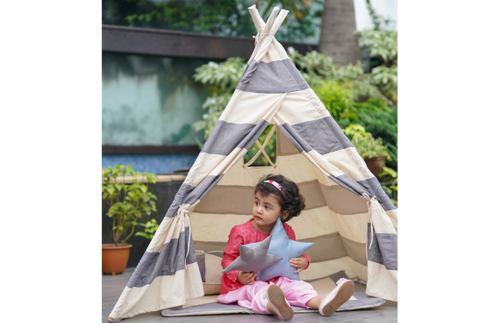 We always strive to produce unique, lovingly handcrafted and practical apparel. And we use only GOTS Certified Organic cotton. This cute, striped tee pee with printed bunting and cushion is perfect for pretend play. Its also very easy to store!