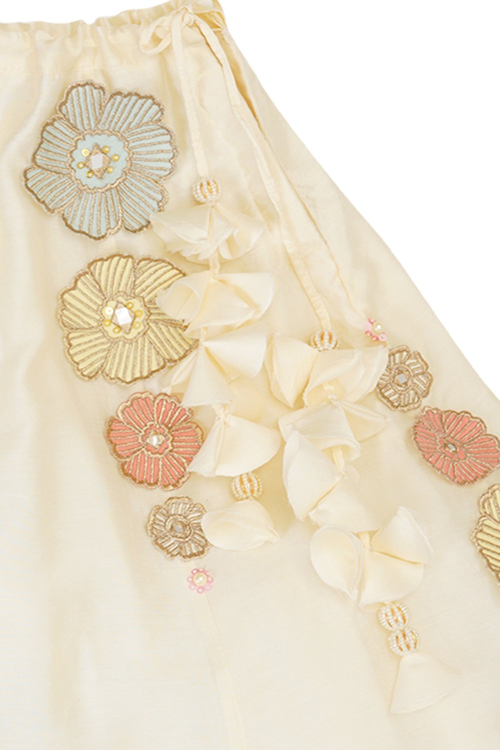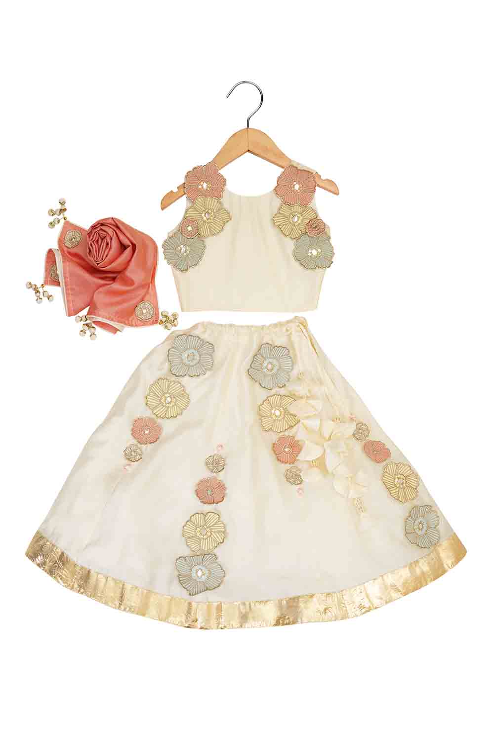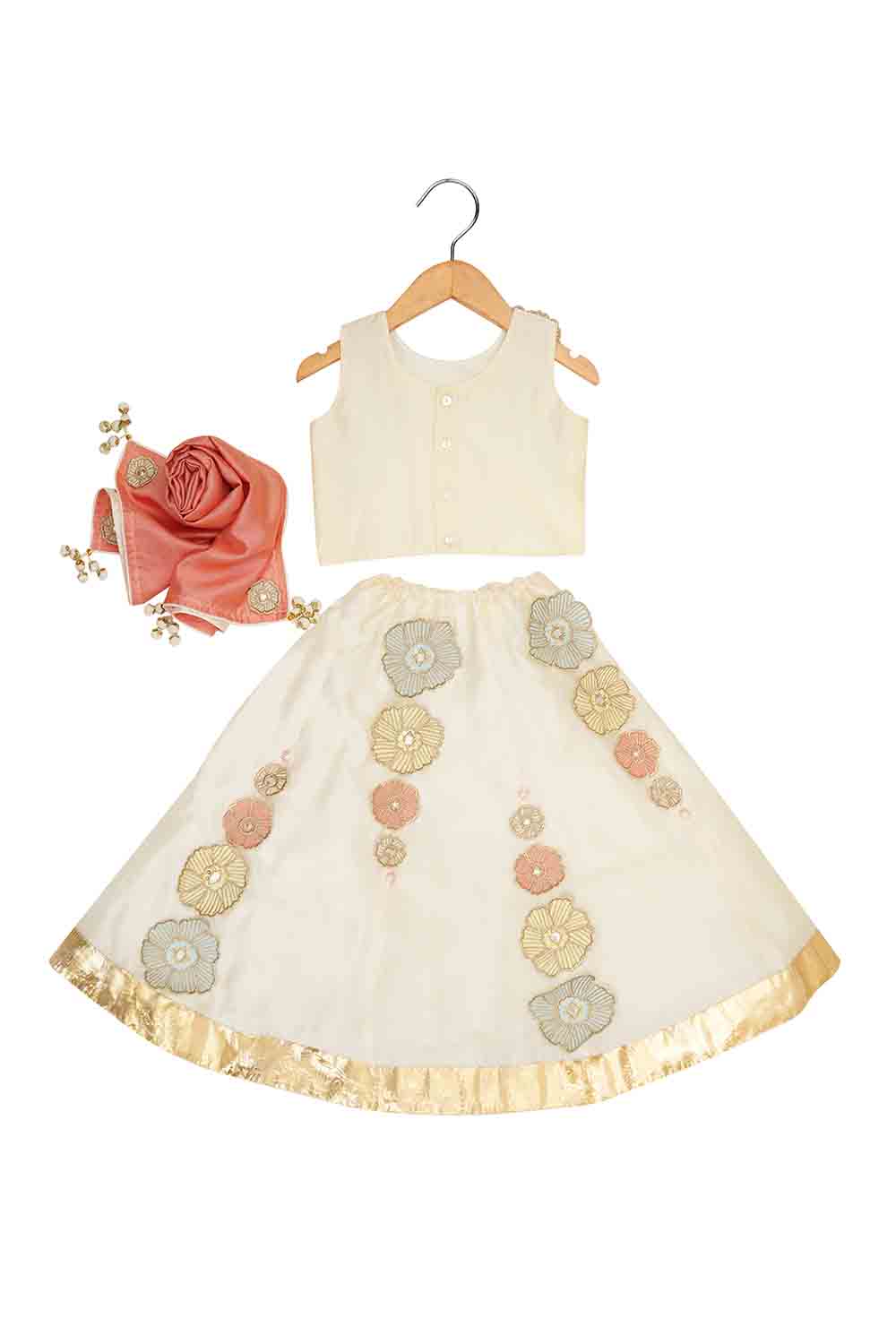 We always strive to produce unique, lovingly handcrafted and practical apparel. And we use only the finest handwoven textiles and GOTS Certified Organic cotton. Our stunning lehnga has beautifully embroidered 3D flowers on the blouse and cascading all over the full gher lehnga. Delicate ivory latkans and the contrast dupatta complete the look. Strikingly beautiful and stylish. Most importantly, there is “no chubhi chubhi”. The entire ensemble is buttery soft and perfect for children’s delicate skin.