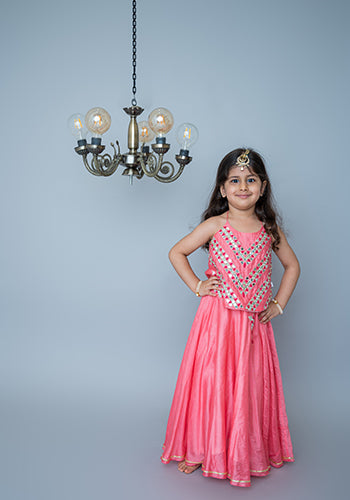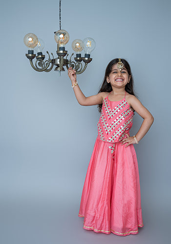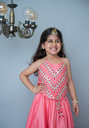 We always strive to produce unique, lovingly handcrafted and practical apparel. And we use only the finest handwoven textiles and GOTS Certified Organic cotton. Our classic sleeveless lehnga is beautifully embroidered with a geometric mirror design accentuated with handmade tassels. Delicately beautiful and stylish. Most importantly, there is "no chubhi chubhi". The entire ensemble is buttery soft and perfect for children's delicate skin.