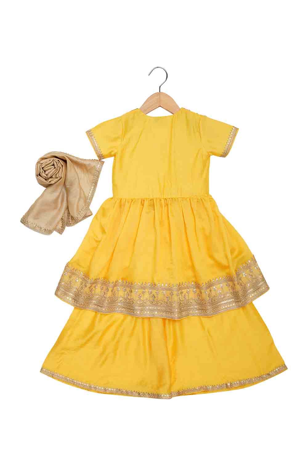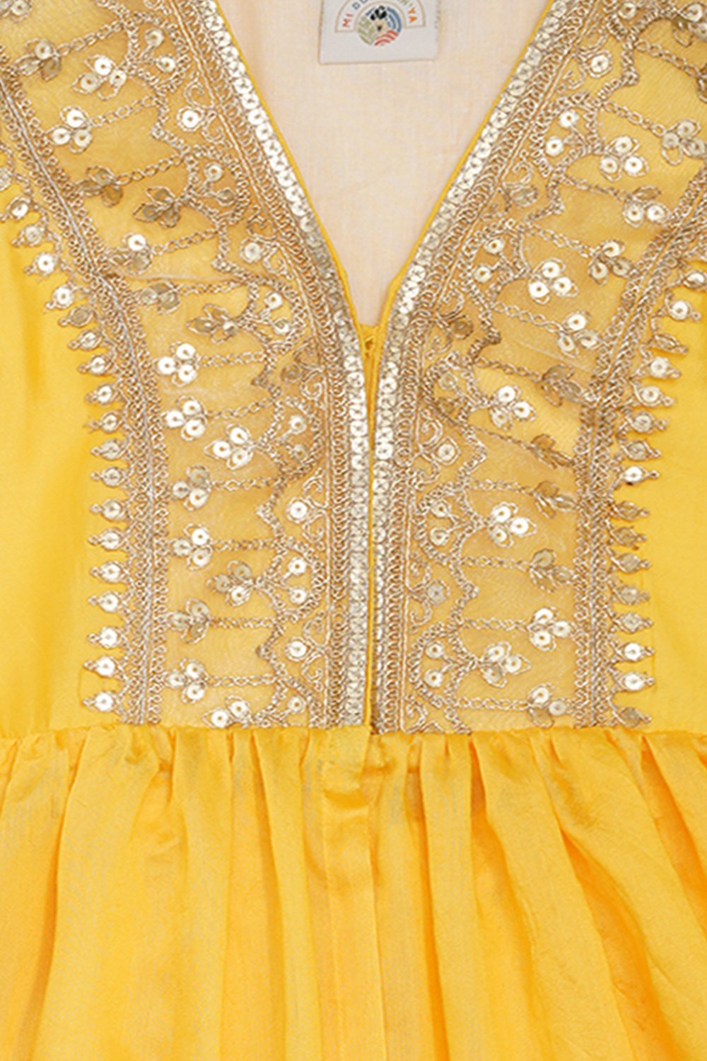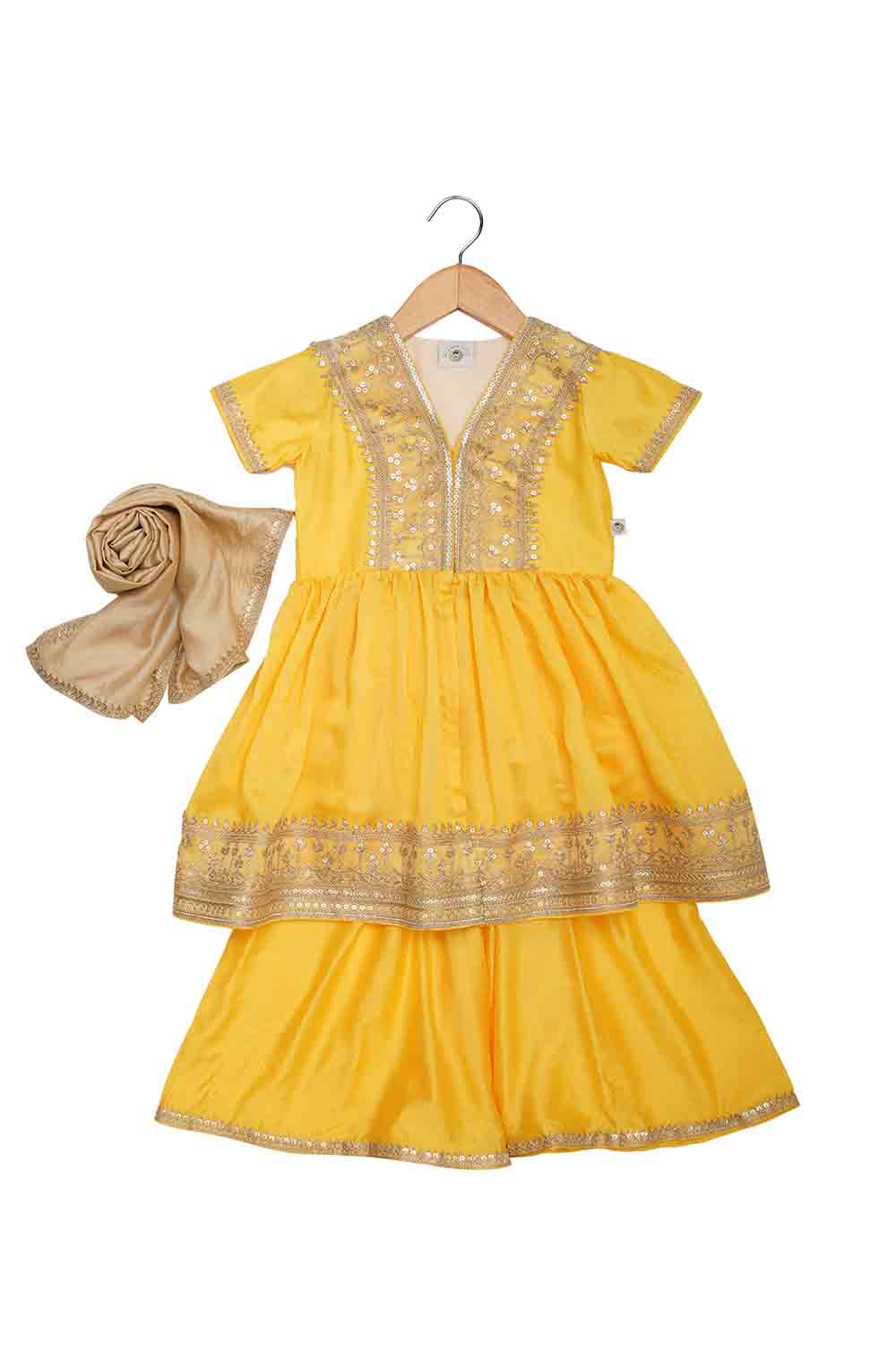 We always strive to produce unique, lovingly handcrafted and practical apparel. And we use only the finest handwoven textiles and GOTS Certified Organic cotton. Our sunshine long blouse with matching flared palazzo pants is delicately embelished with beaten gold lace. The contrast dupatta with matching embellishment completes the look. Strikingly beautiful and stylish. Most importantly, there is āno chubhi chubhiā. The entire ensemble is buttery soft and perfect for childrenās delicate skin.