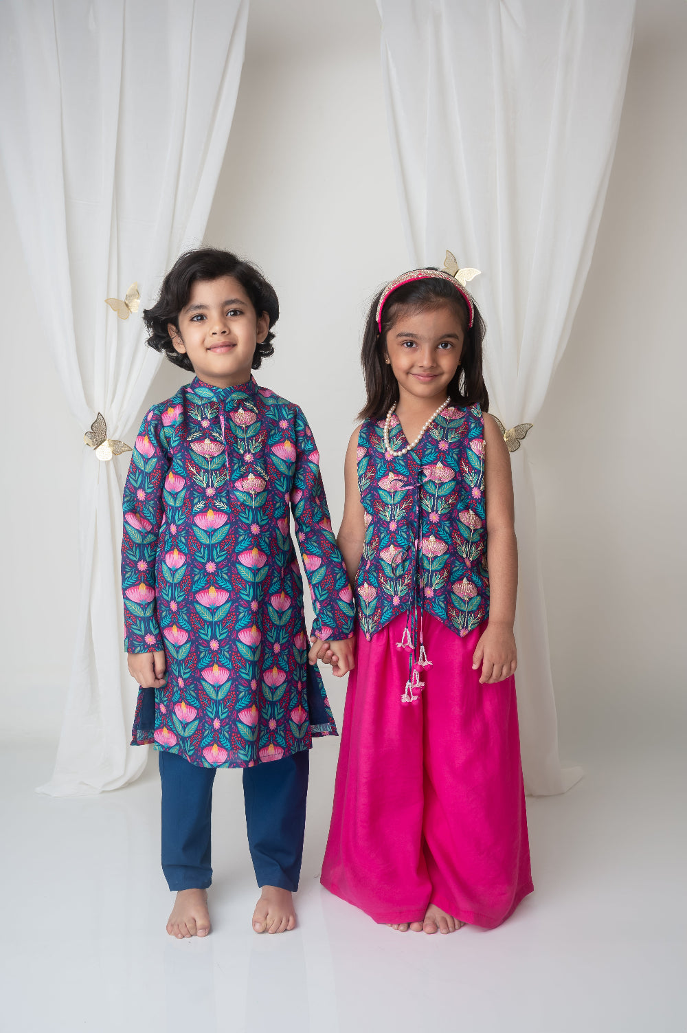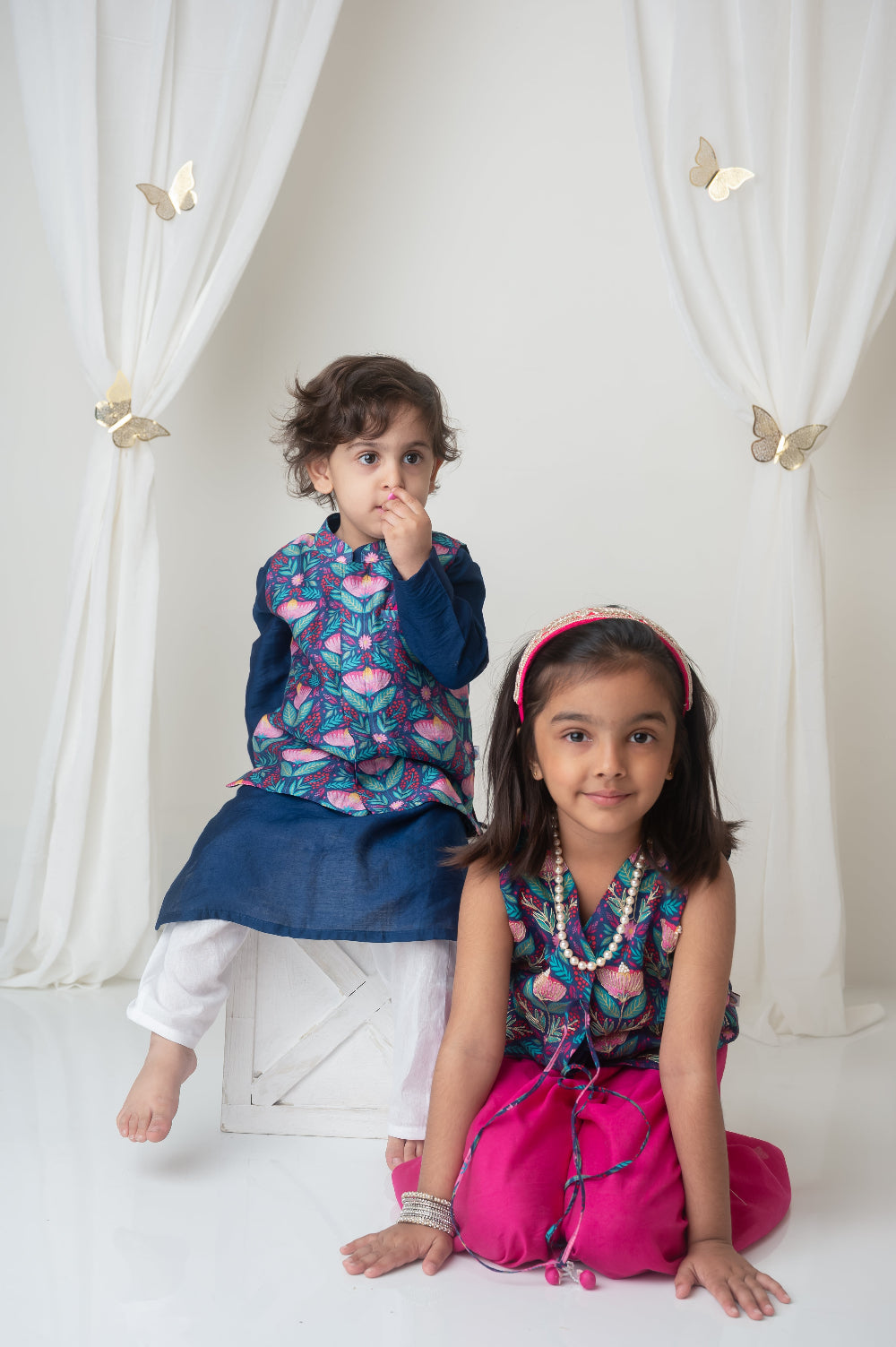 We always strive to produce unique, lovingly handcrafted and practical apparel. And we use only the finest handwoven textiles and GOTS Certified Organic cotton. Our custom printed waistcoat with iconic tassels is fun and irreverent, and is enhanced with delicate zari, thread and pearl work. It contrasts against the flared palazzo perfectly. The outfit is fun and feather weight. Most importantly, there is "no chubhi chubhi". The entire ensemble is buttery soft and perfect for children's delicate skin. Made of handwoven chanderi lined with Certified Organic coton
