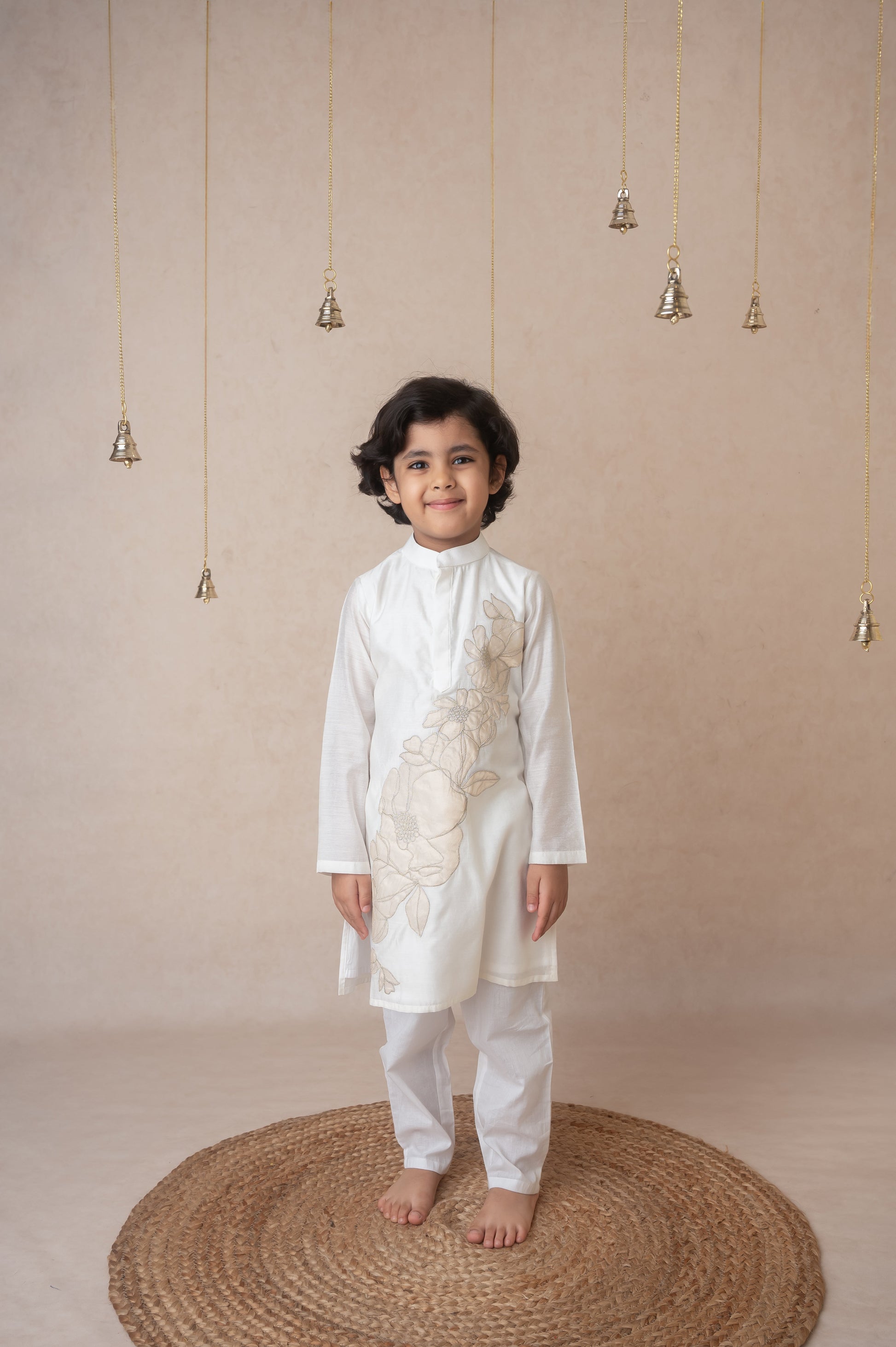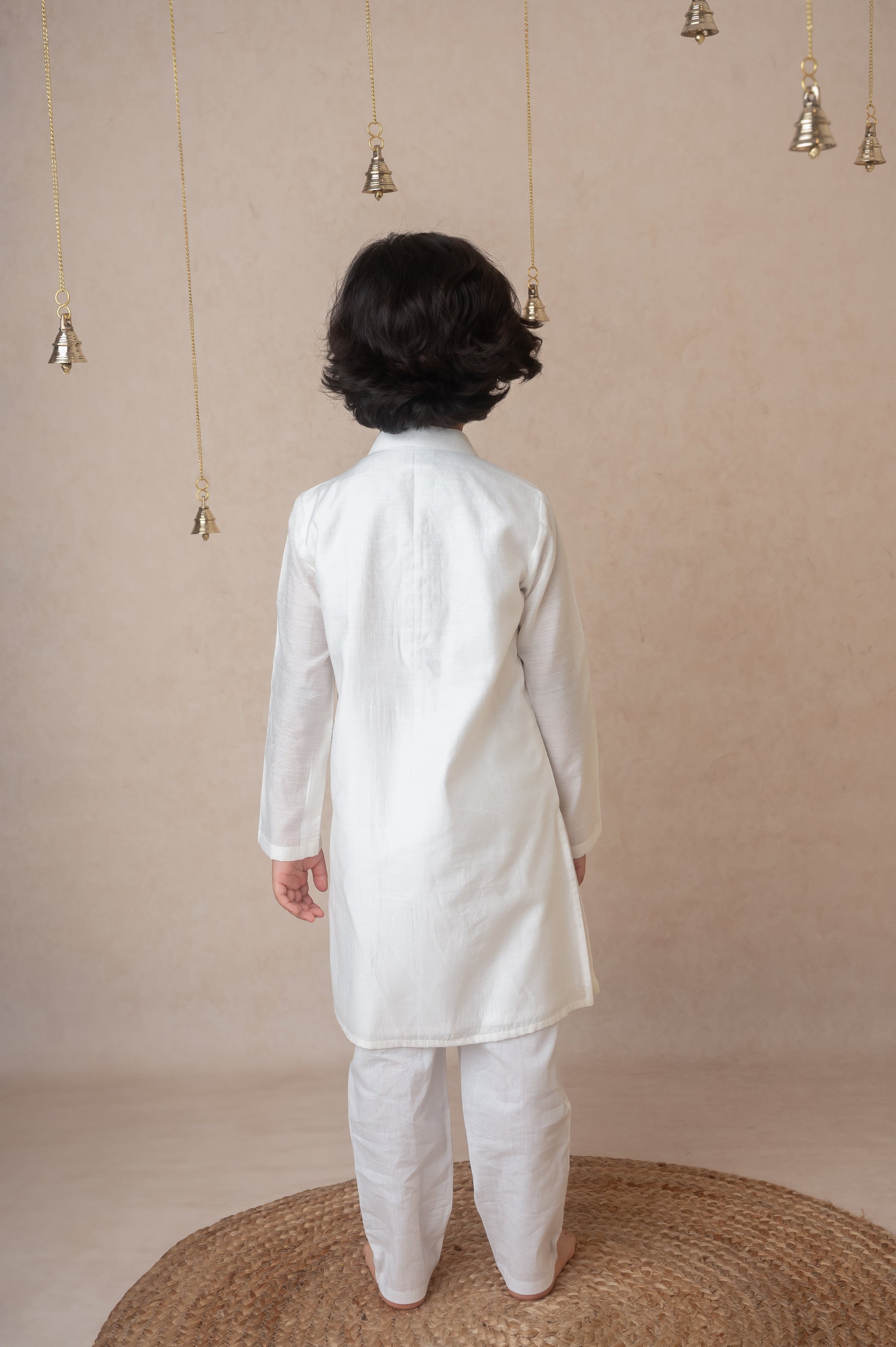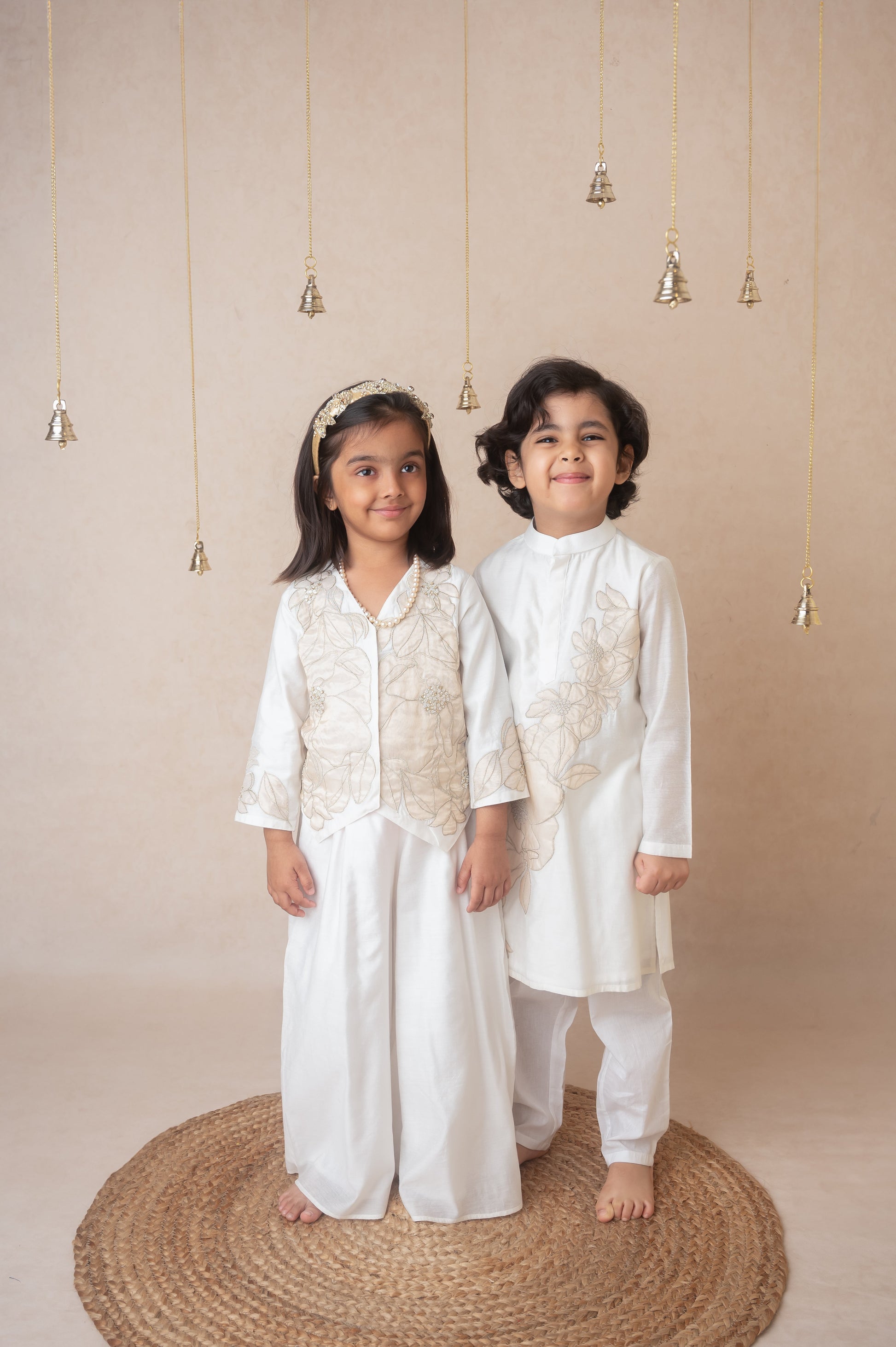 We always strive to produce unique, lovingly handcrafted and practical apparel. And we use only GOTS Certified Organic cotton and the finest handwoven textiles. Our soothingly beautiful, delicately embroidered kurta is so different from anythign else we have created before! Paired with classic ivory pajama. Most importantly, there is NO CHUBHI CHUBHI. The entire ensemble is buttery soft and perfect for children's delicate skin. Material composition: Made of handwoven chanderi lined with Certified Organic cotton