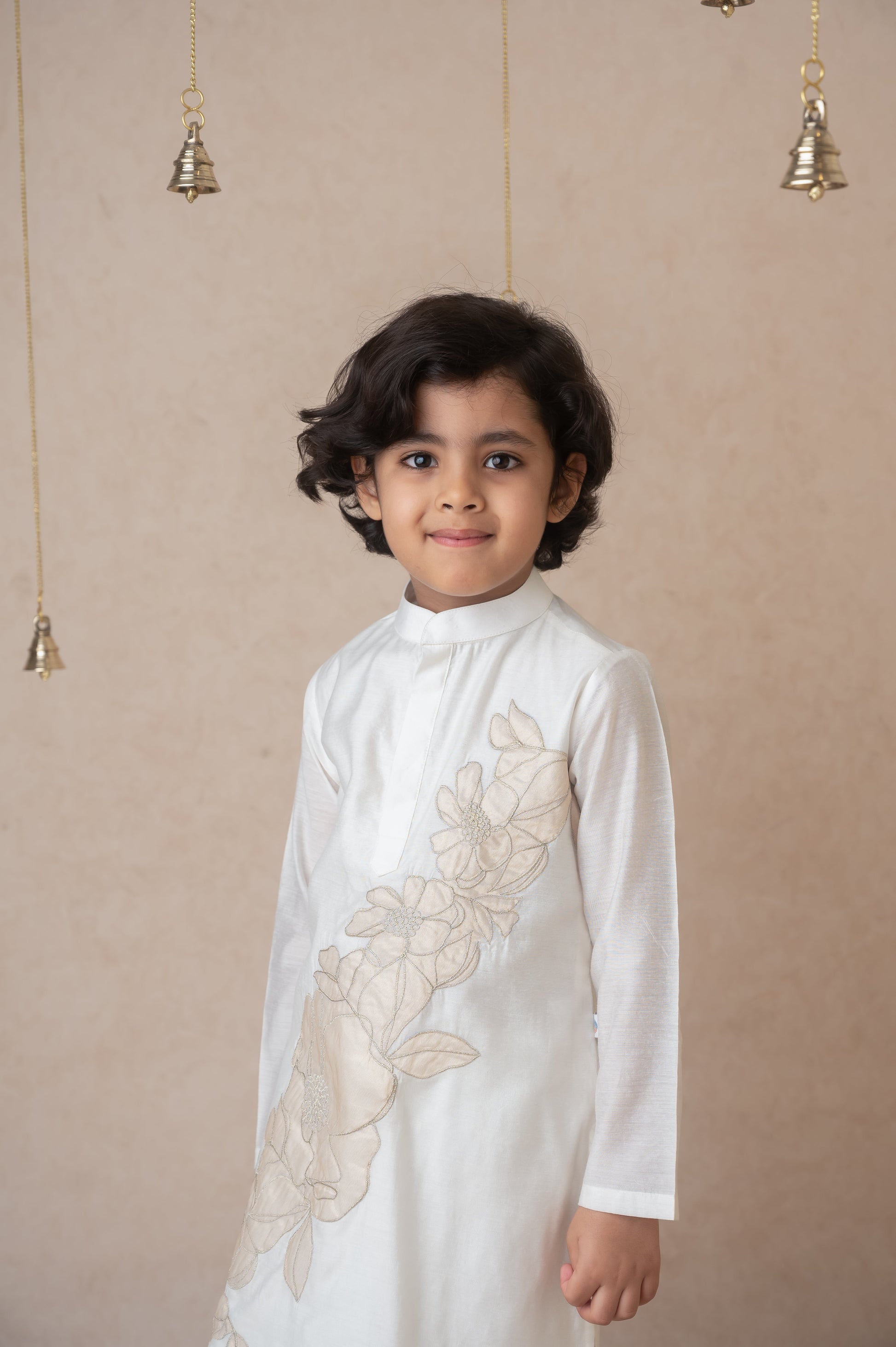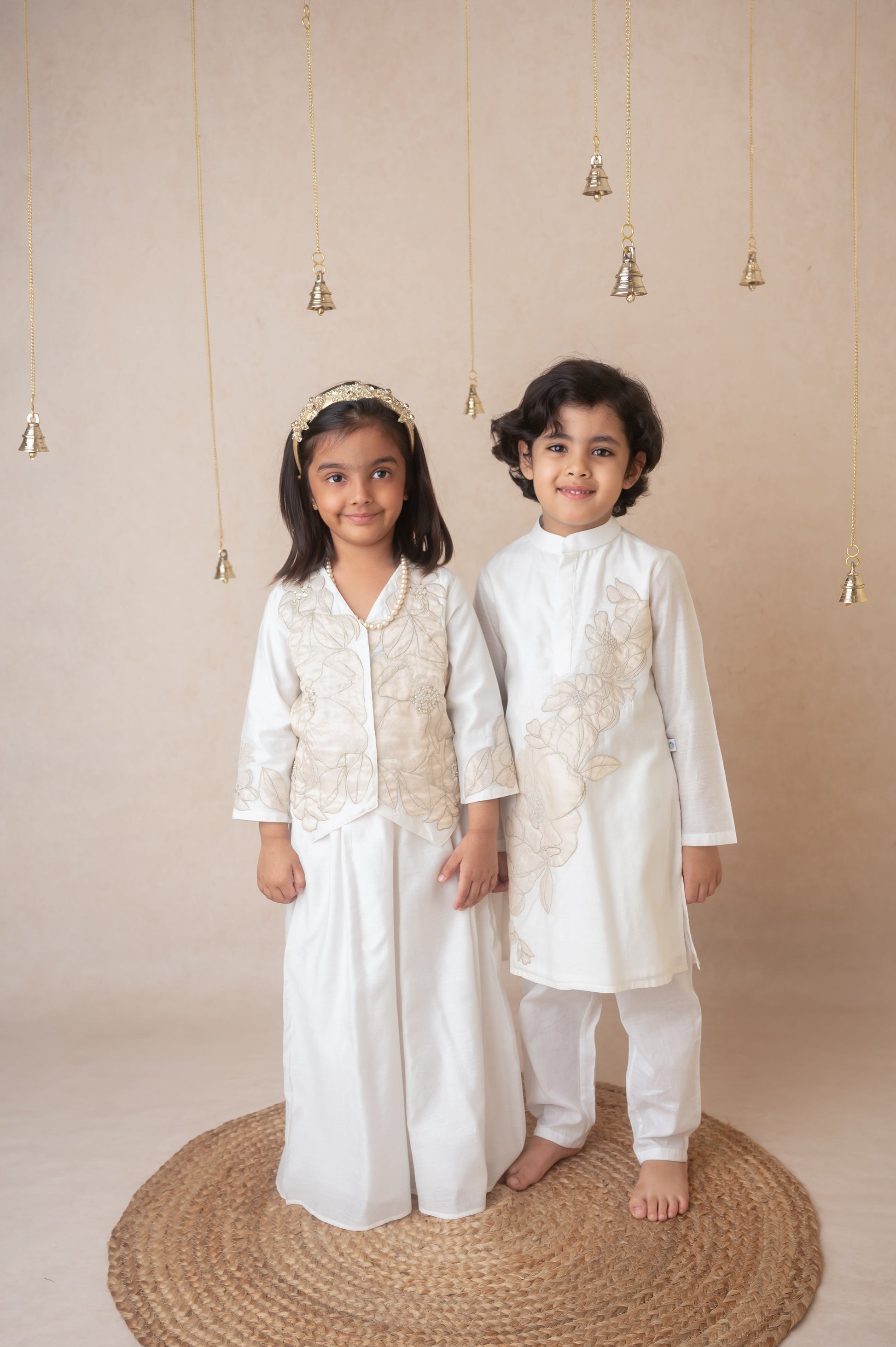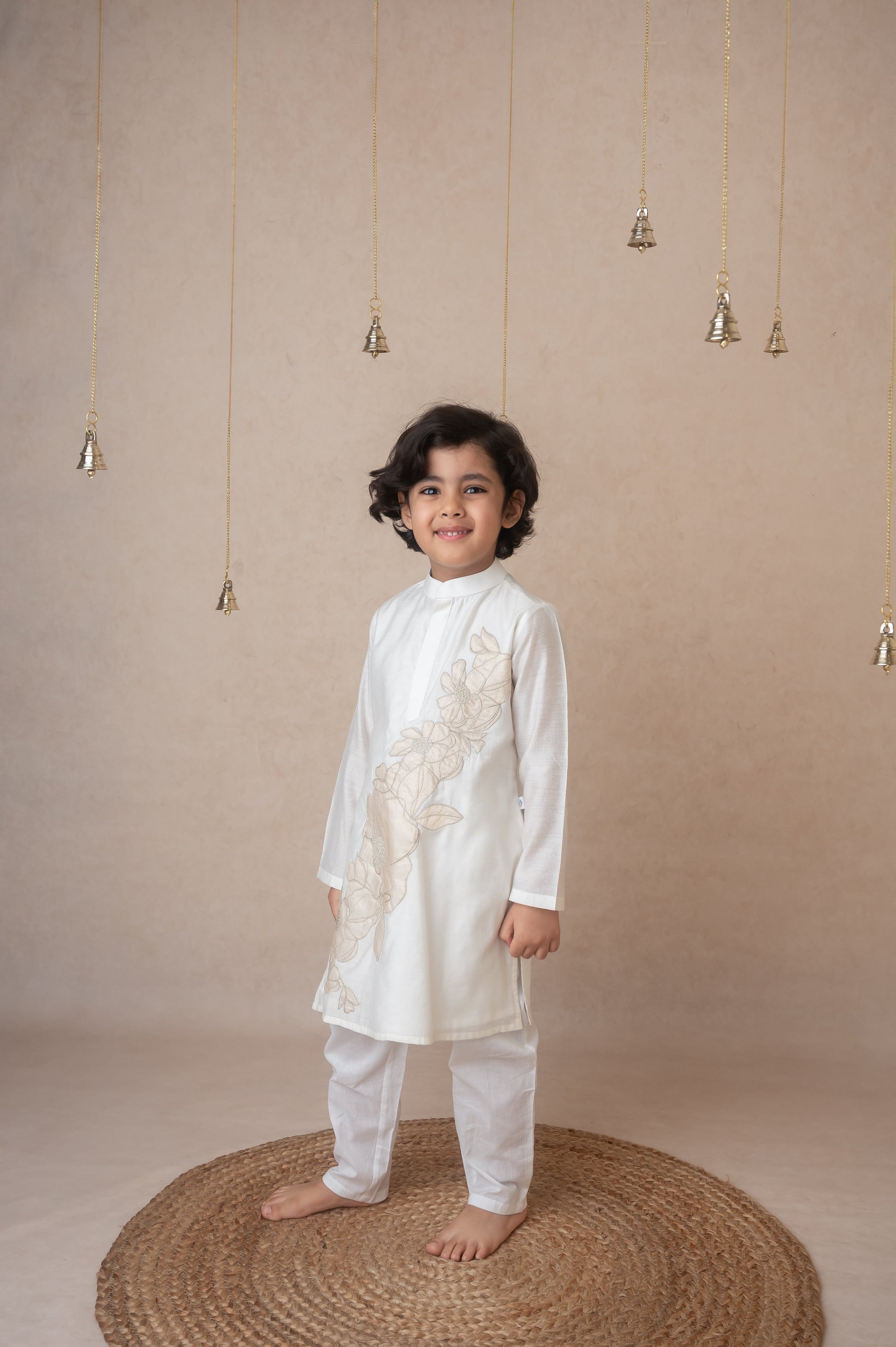 We always strive to produce unique, lovingly handcrafted and practical apparel. And we use only GOTS Certified Organic cotton and the finest handwoven textiles. Our soothingly beautiful, delicately embroidered kurta is so different from anythign else we have created before! Paired with classic ivory pajama. Most importantly, there is NO CHUBHI CHUBHI. The entire ensemble is buttery soft and perfect for children's delicate skin. Material composition: Made of handwoven chanderi lined with Certified Organic cotton