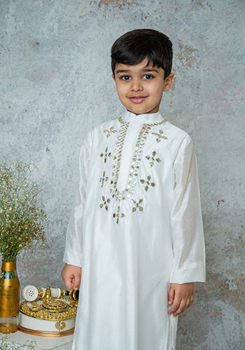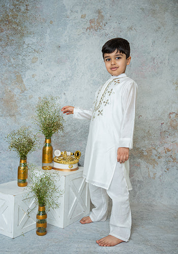 We always strive to produce unique, lovingly handcrafted and practical apparel. And we use only GOTS Certified Organic cotton and the finest handwoven textiles. Our classic mirror embroidered kurta is complemented perfectly with contrast pajama kurta. Most importantly, there is NO CHUBHI CHUBHI. The entire ensemble is buttery soft and perfect for children's delicate skin.