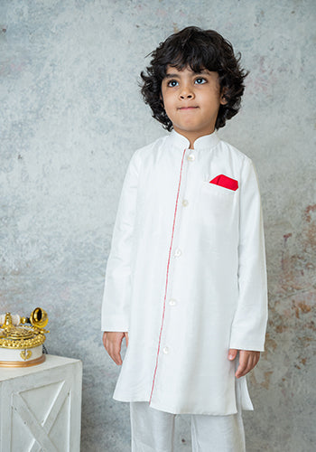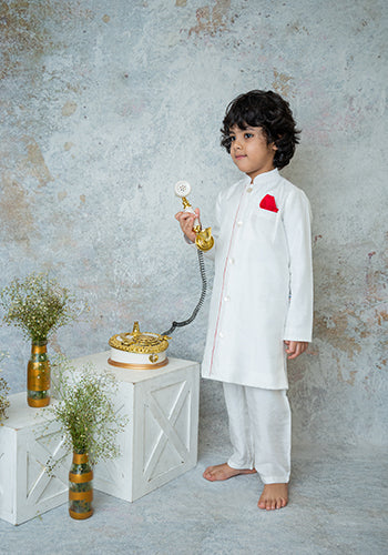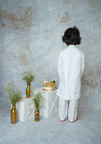 We always strive to produce unique, lovingly handcrafted and practical apparel. And we use only GOTS Certified Organic cotton and the finest handwoven textiles. Our classic bandhgala with mirror embroidery is complemented perfectly with contrast pajama kurta. Most importantly, there is NO CHUBHI CHUBHI. The entire ensemble is buttery soft and perfect for children's delicate skin.