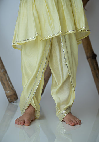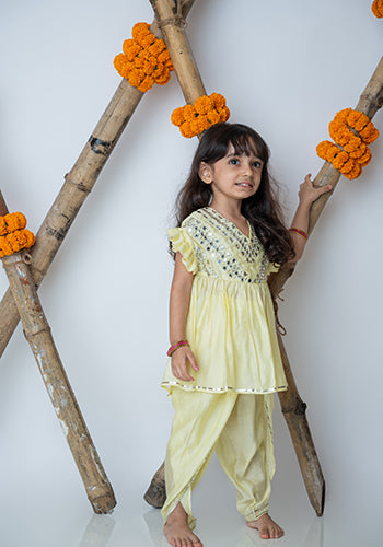 We always strive to produce unique, lovingly handcrafted and practical apparel. And we use only the finest handwoven textiles and GOTS Certified Organic cotton. Our classic dhoti is beautifully embroidered with a geometric mirror design. Delicately beautiful and stylish. Most importantly, there is "no chubhi chubhi". The entire ensemble is buttery soft and perfect for children's delicate skin.