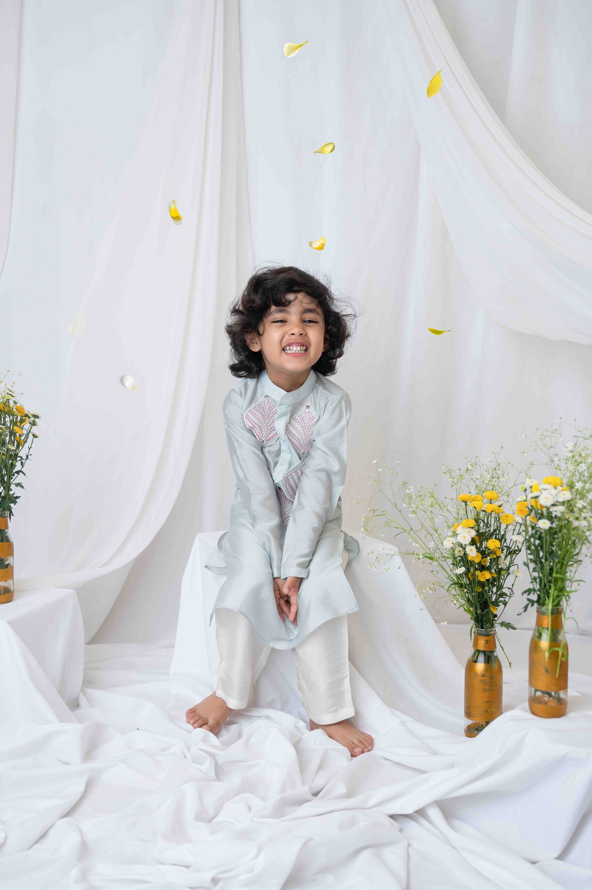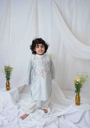 We always strive to produce unique, lovingly handcrafted and practical apparel. And we use only GOTS Certified Organic cotton and the finest handwoven textiles. Our classic bandhgala with mirror embroidery is complemented perfectly with contrast pajama kurta. Most importantly, there is NO CHUBHI CHUBHI. The entire ensemble is buttery soft and perfect for children's delicate skin.