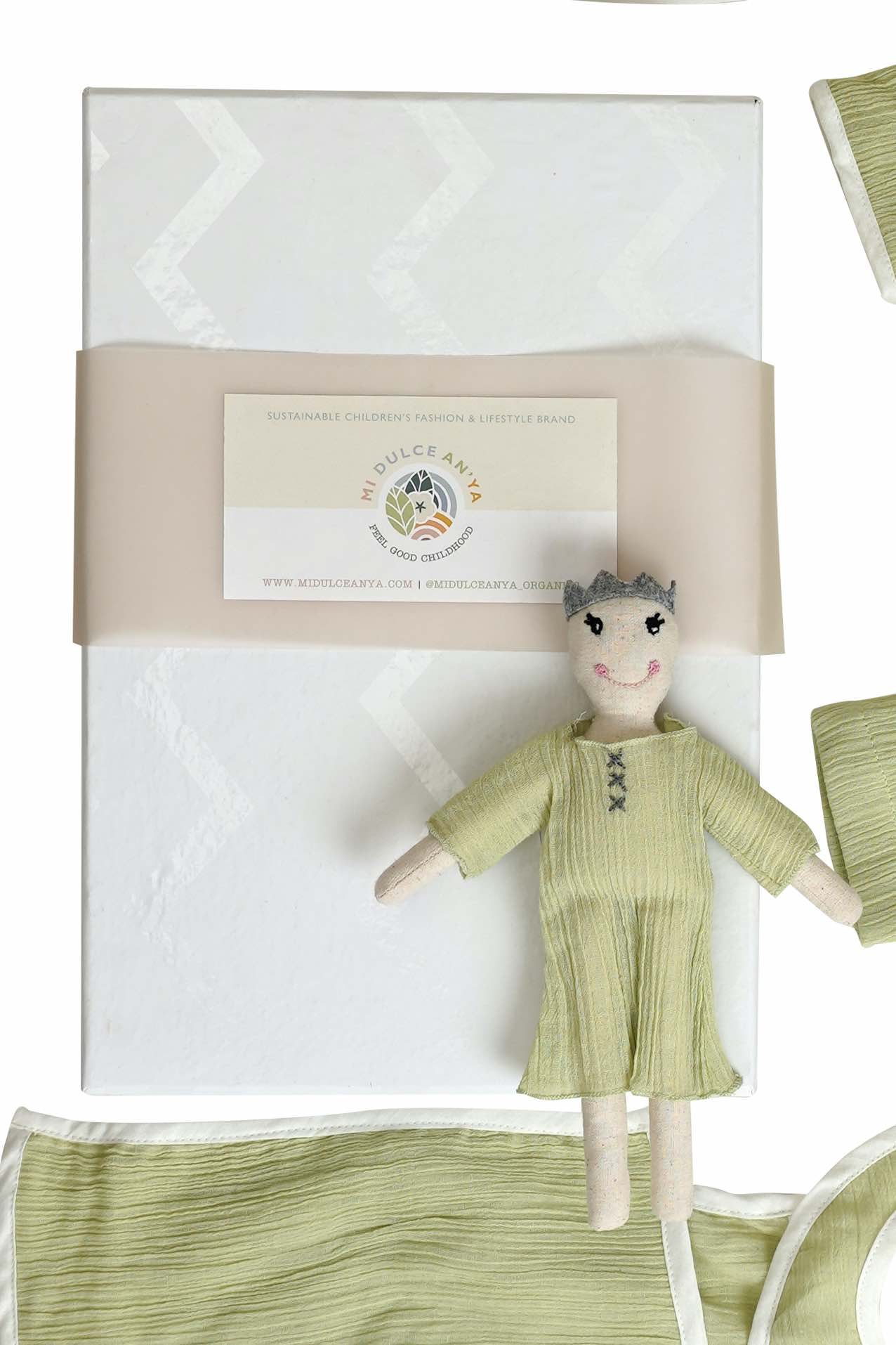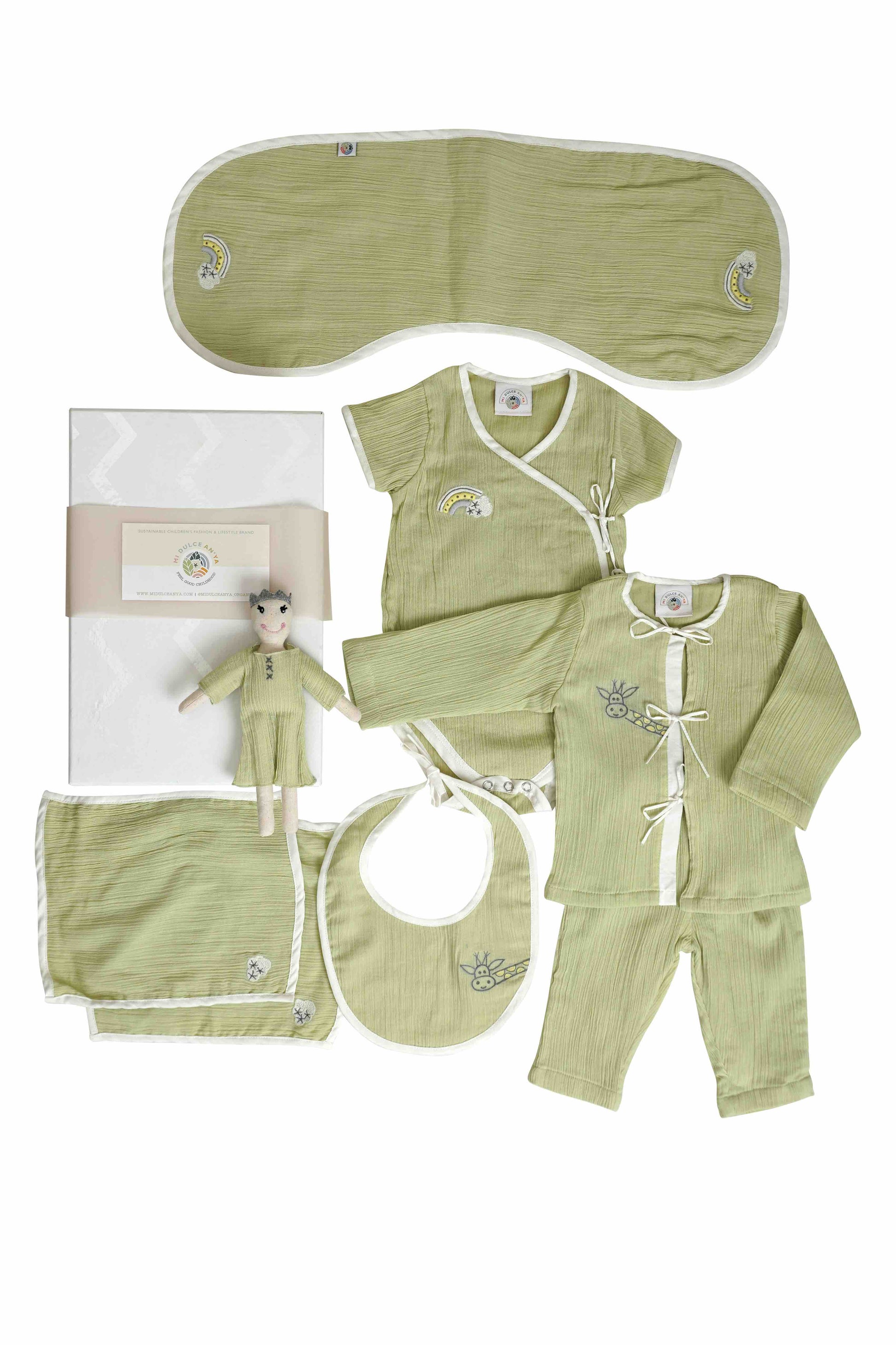 We always strive to produce unique and lovingly handcrafted pieces using only the finest GOTS Certified Organic cotton. This luxury gift set has everything a new baby needs. Buttery soft crinkled cottom with custom eembroidery accents make this a very valued gift indeed!