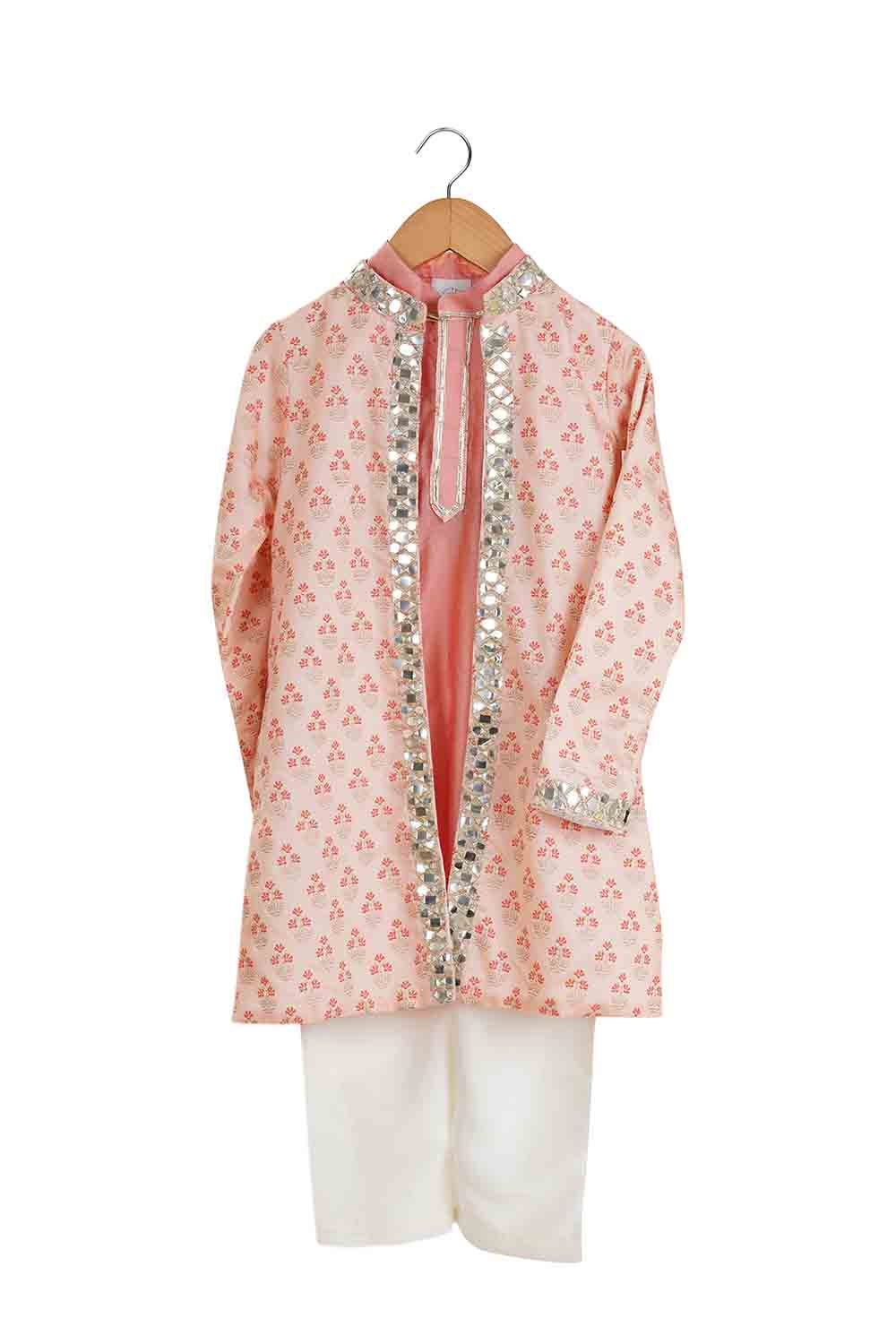 We always strive to produce unique, lovingly handcrafted and practical apparel. And we use only GOTS Certified Organic cotton and the finest handwoven textiles. Our traditional embellished sherwani is complemented perfectly with matching kurta dn ivory, relaxed fit pants. Most importantly, there is NO CHUBHI CHUBHI. The entire ensemble is buttery soft and perfect for children’s delicate skin.