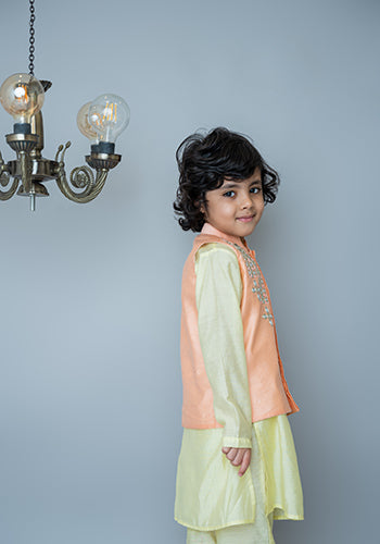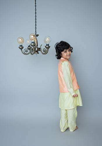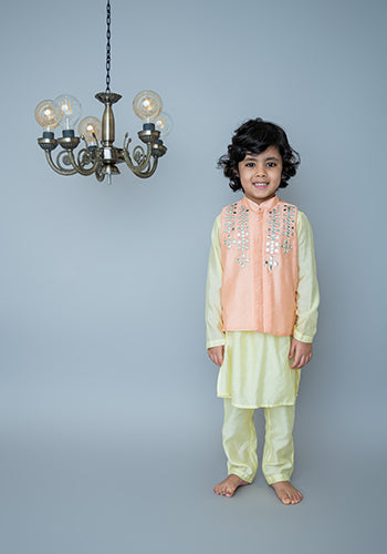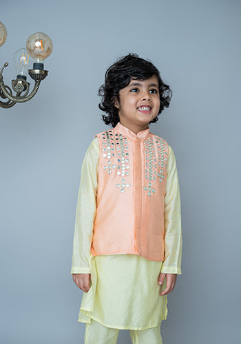 We always strive to produce unique, lovingly handcrafted and practical apparel. And we use only GOTS Certified Organic cotton and the finest handwoven textiles. Our classic bandhgala with mirror embroidery is complemented perfectly with contrast pajama kurta. Most importantly, there is NO CHUBHI CHUBHI. The entire ensemble is buttery soft and perfect for children's delicate skin.