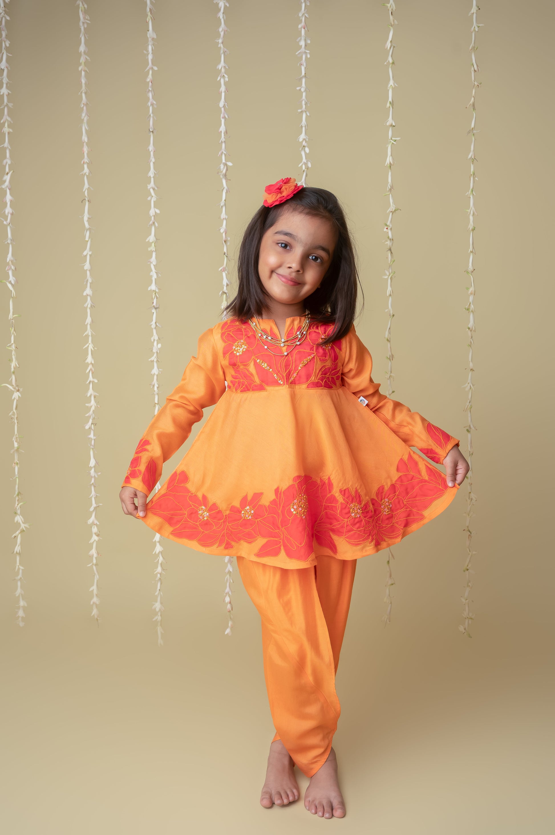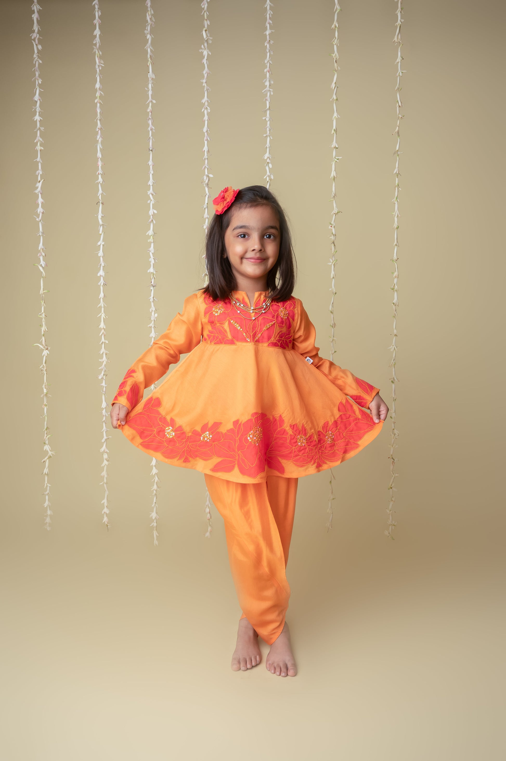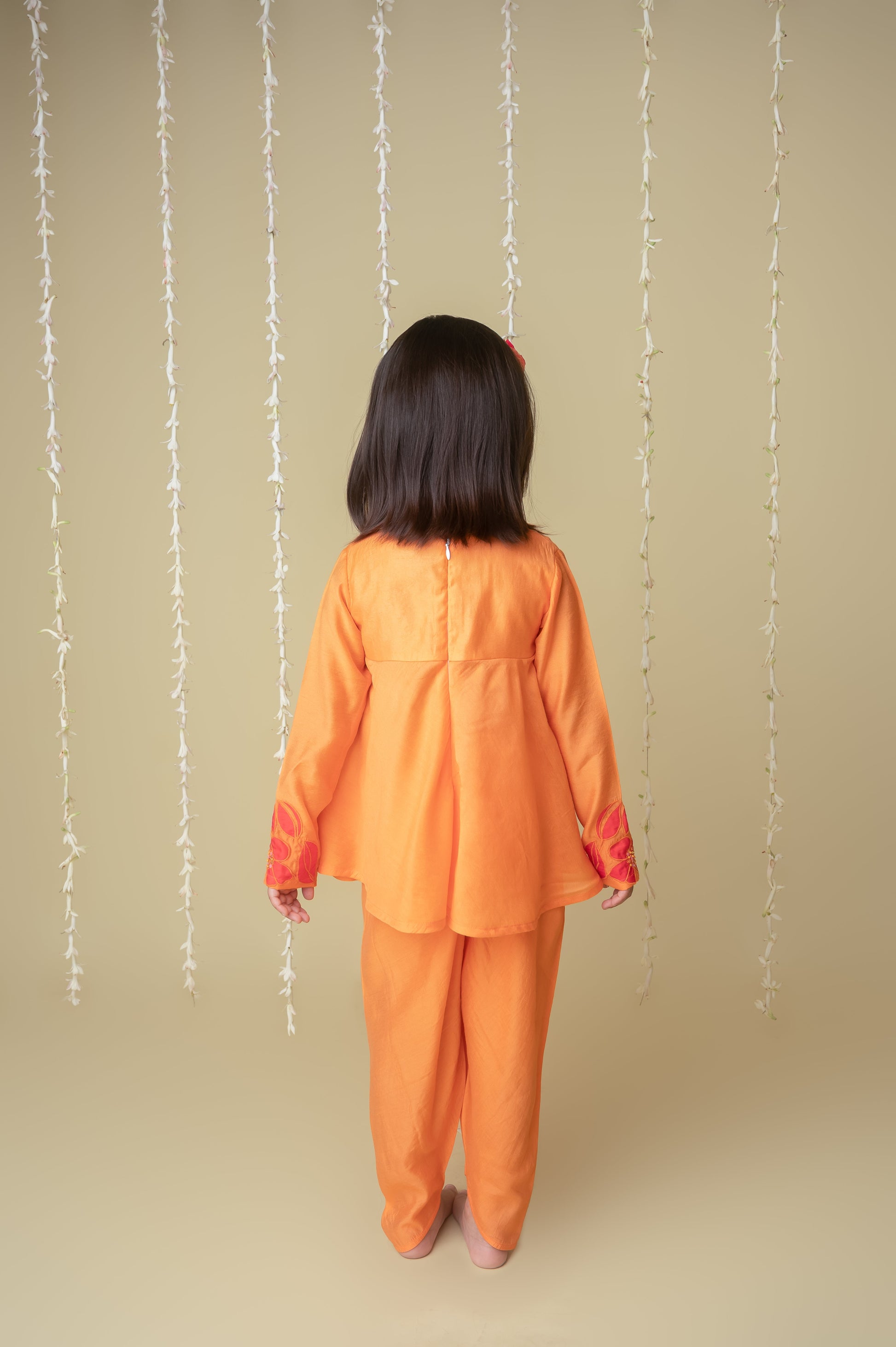 We always strive to produce unique, lovingly handcrafted and practical apparel. And we use only the finest handwoven textiles and GOTS Certified Organic cotton. Our delicately embroidered hip length blouse is beautifully accentuated with zari threadwork and sequin pearl accents, and matches the stylized dhoti pants perfectly. The outfit is demure and feather weight. Most importantly, there is "no chubhi chubhi". The entire ensemble is buttery soft and perfect for children's delicate skin. Made of handwoven chanderi lined with Certified Organic cotton