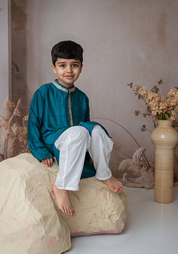 We always strive to produce unique, lovingly handcrafted and practical apparel. And we use only GOTS Certified Organic cotton and the finest handwoven textiles. Our classic kurta with beaten gold neck patti is complemented perfectly with contrast pajama. Most importantly, there is NO CHUBHI CHUBHI. The entire ensemble is buttery soft and perfect for children's delicate skin.