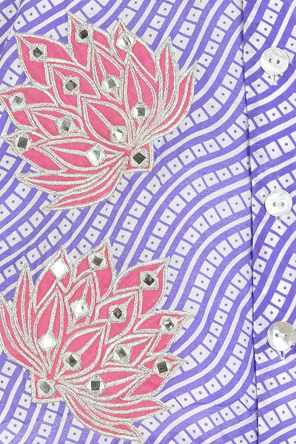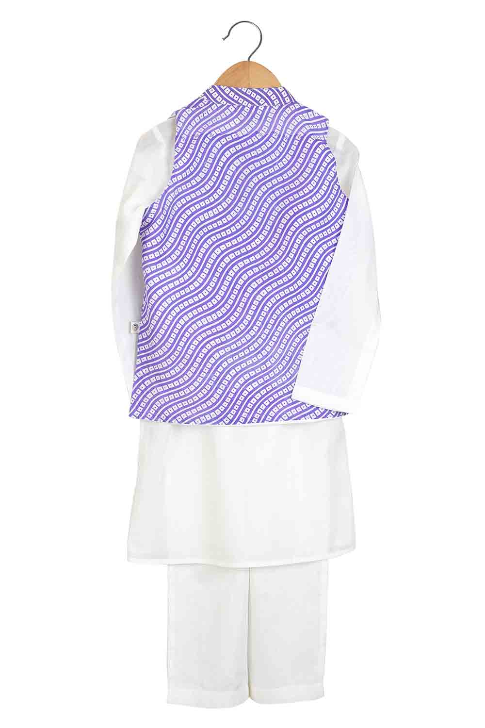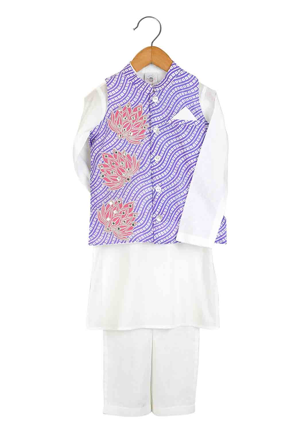 We always strive to produce unique, lovingly handcrafted and practical apparel. And we use only GOTS Certified Organic cotton and the finest handwoven textiles. Our vibrant leheriya print bandhgala with hand embroidered lotus flowers is complemented perfectly with ivory kurta and relaxed fit pants. Most importantly, there is NO CHUBHI CHUBHI. The entire ensemble is buttery soft and perfect for children’s delicate skin.